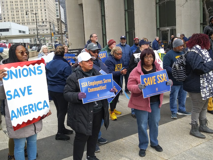 AFGE workers holding signs at federal bldg., April 4, 2025