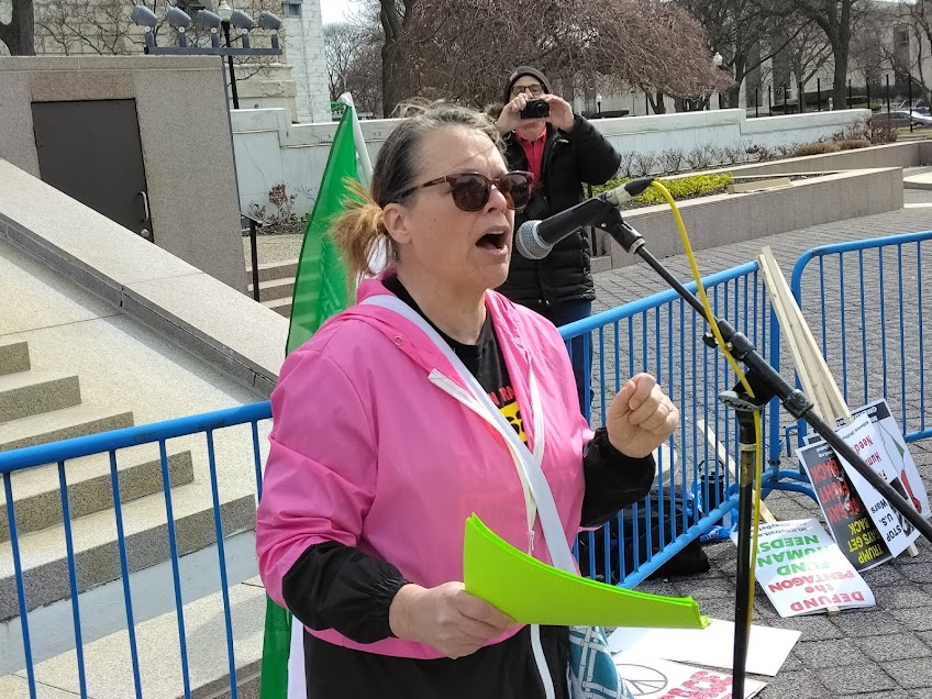 Detroit demonstration on Iran war, speaker addressing Romulus anti-ICE campaign, March 15, 2026